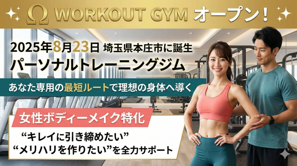 ✨Ω WORKOUT GYM オープン!✨ 2025年8月23日、埼玉県本庄市にパーソナルトレーニングジムが誕生しました。 Ω WORKOUT GYMでは、「あなた専用の最短ルートで理想の身体へ導く」ことを大切にしています。特に、近年人気の 女性ボディーメイク にも力を入れて... -